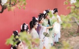 4月11日,在甘肃省皋兰县什川镇百年梨园内,汉服爱好者游玩赏花...